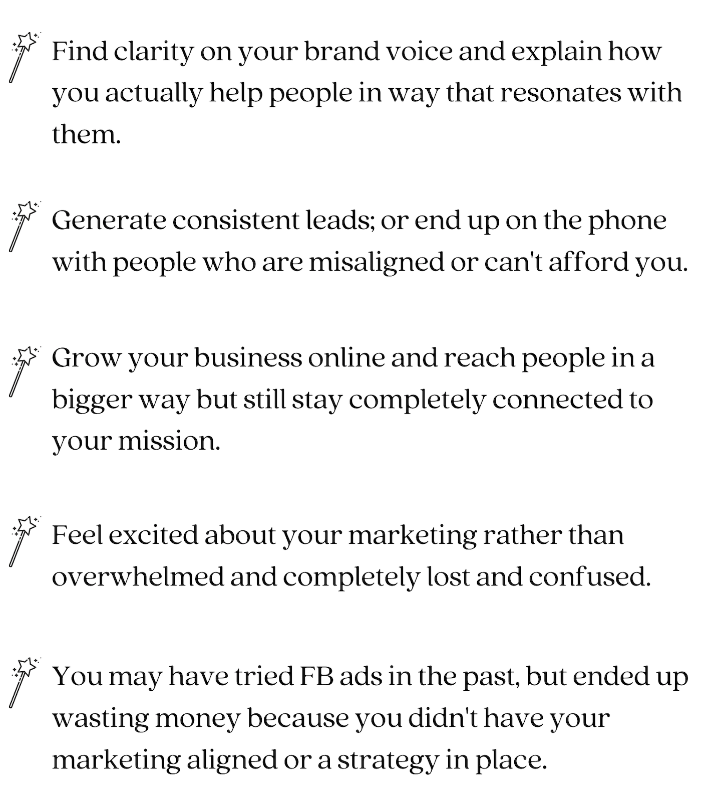 I support coaches, healers, creatives and entrepreneurs navigate the world of Facebook Ads, create comprehensive marketing strategies and execute campaigns that drive real-world results.
